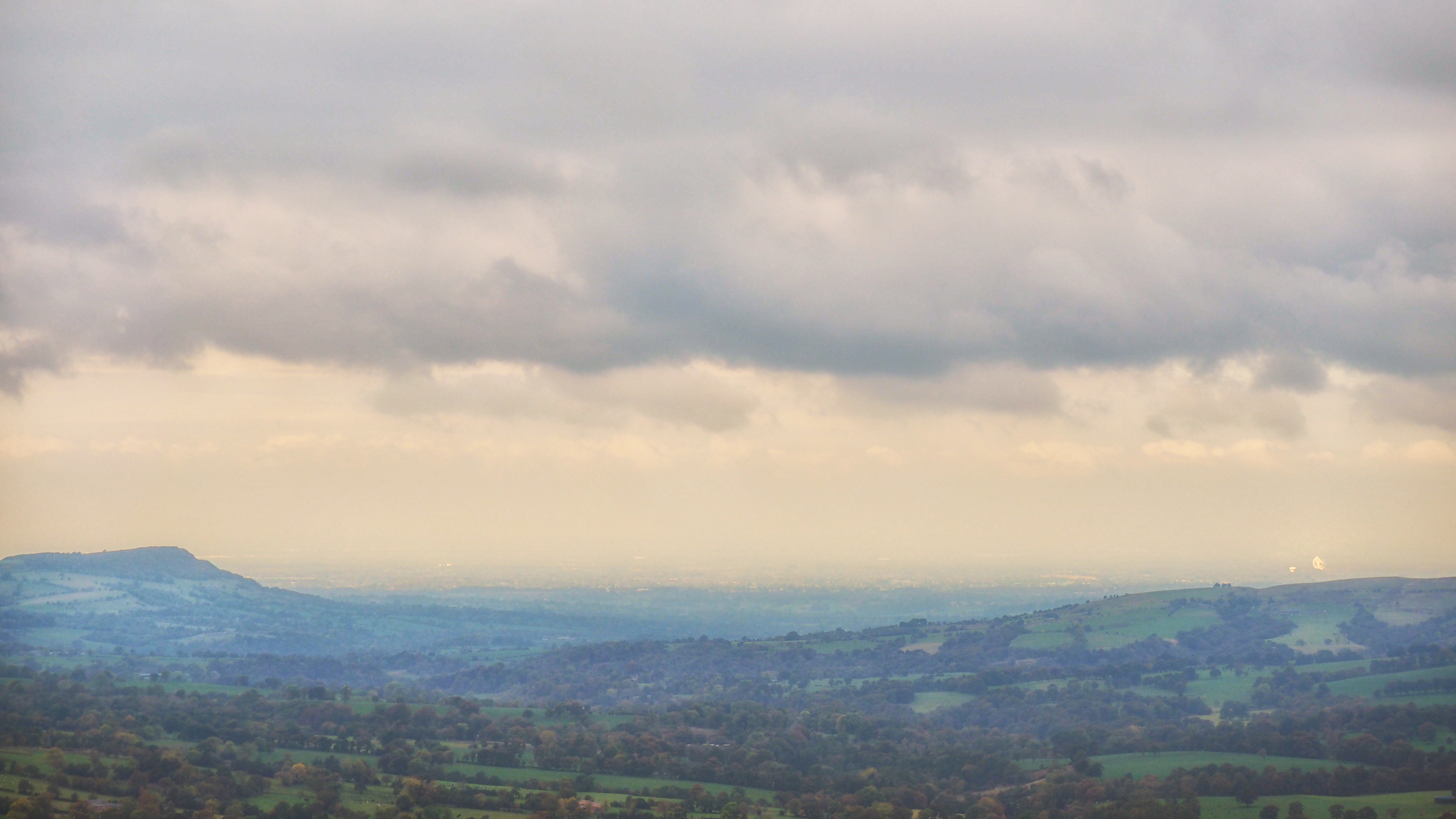 The vista across towards Cheshire was beautiful even on a hazy day. Jodrell Bank telescope shone in the sunlight whilst we were clearly amongst low cloud. A great walk, one I must return to for a sunset view someday.