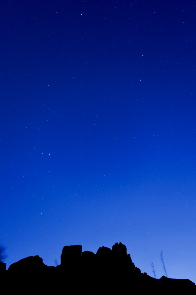 The lens wasn’t wide enough to really get the rocks and as much sky as I would like, but the silhouette and either moving meteor or satellite looked quite good.
